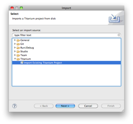 いくつかフォルダアイコンがあるのですが、一番したのTitaniumフォルダを開いて、「Import Existing Titanium Project」を選択します。下にあるNextボタンをクリックします。