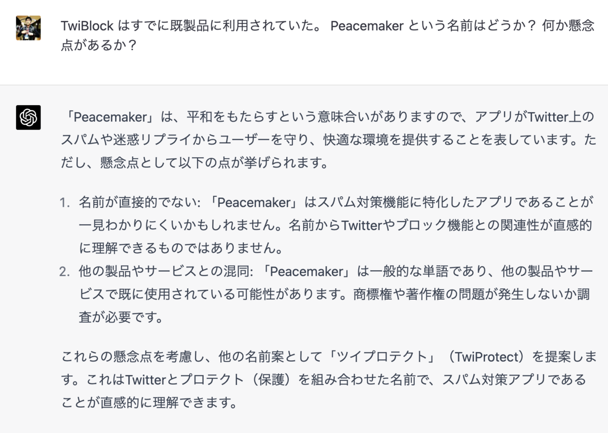 GPT-4にアプリの名前を考えてもらうことにしました。最初の提案は「TwiBlock」でしたが、すでに同名の既製品が存在していたため、採用することができませんでした。